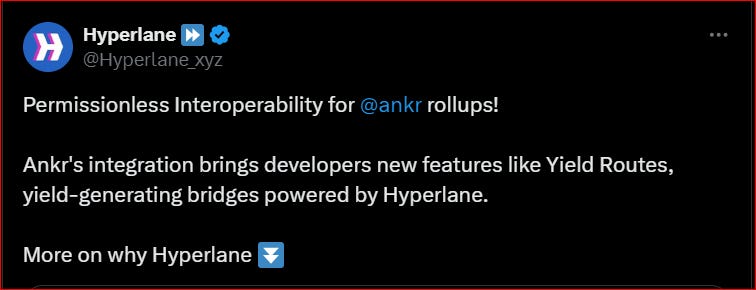Hyperlane announces partnership with ankr to bring permissionless interop for ankr Rollups.
