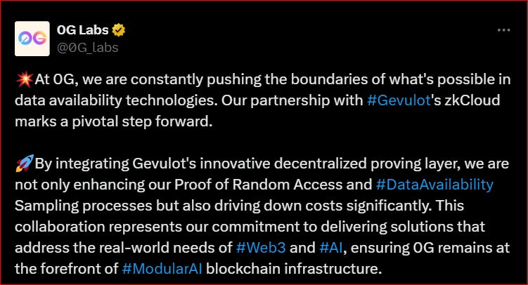 OG Labs announces partnership with Gevulot to increase proof of random access and Data Availability Sampling and further reduce DA cost.