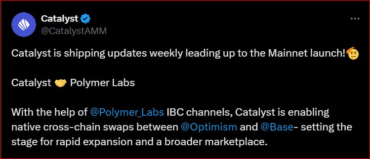 Catalyst announces partnership with Polymer Labs to enable native cross-chain swaps between Optimism and Base.