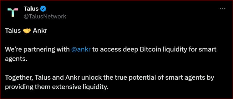 Talus announces partnership with Ankr to access Bitcoin deep Bitcoin liquidity for smart agents.