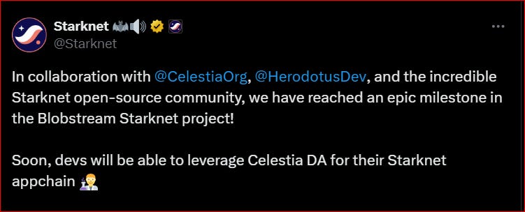 Starknet in partnership with Herodotus announces Starknet appchains will use Celestia as DA.