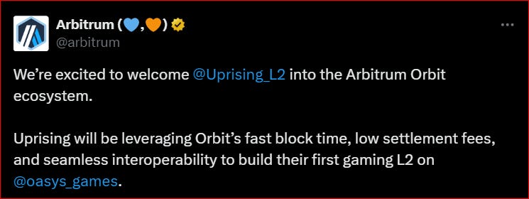 Arbitrum announces to welcome Uprising Blockchain into the Arbitrum Orbit ecosystem; which will be building its first game on Oasys.